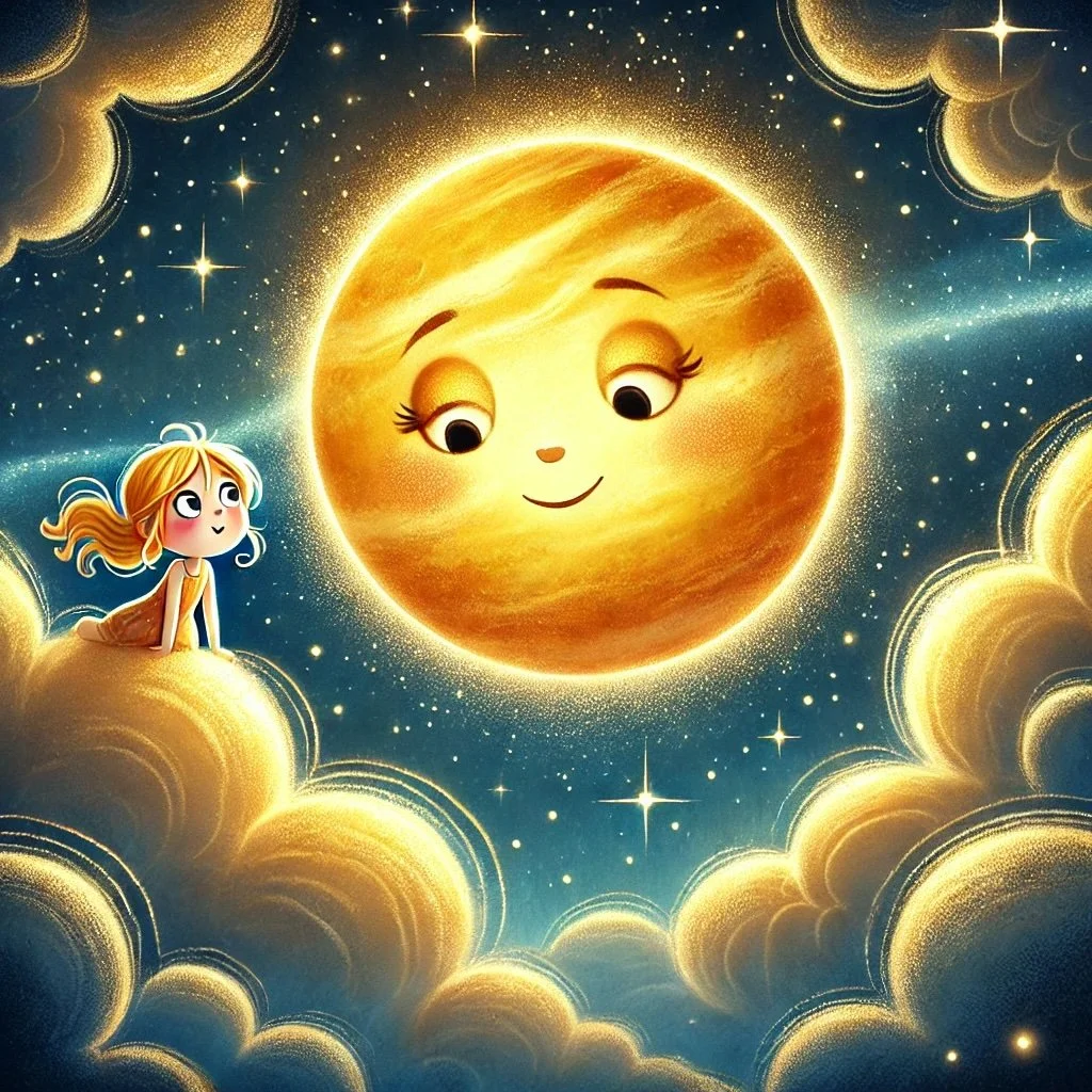 One evening, Ellie sat by her window, looking up at the bright evening sky. She knew that Venus, the planet closest to Earth, often shone brightly in the evening. Curious to learn more, Ellie closed her eyes, and suddenly, she was floating through space again. When she opened her eyes, she was face-to-face with a planet that glowed in shades of yellow and gold.