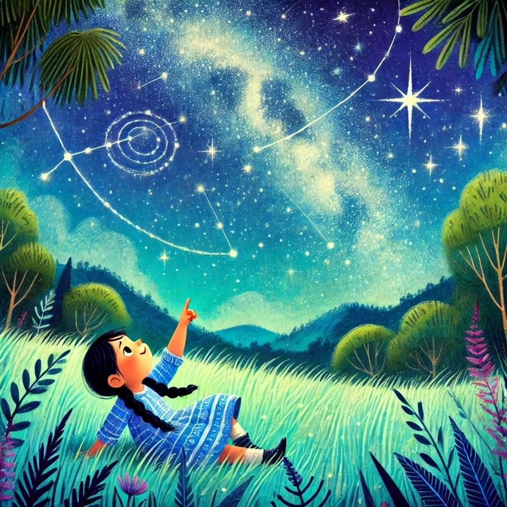The night sky stretched endlessly above Lola as she lay on the soft grass, staring at the millions of twinkling stars. It was a clear evening, and the air smelled fresh, like the earth after rain.